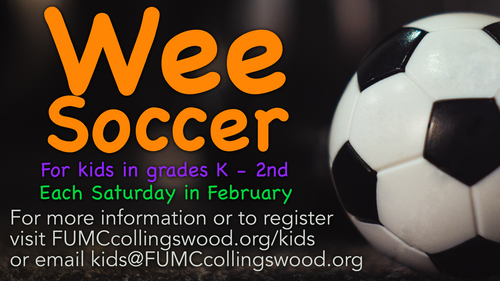 Our indoor Wee Soccer program takes place each Saturday in February (7th, 14th, 21st, 28th). PreK-3rd grade, $10.00 per child for all 4 weeks.